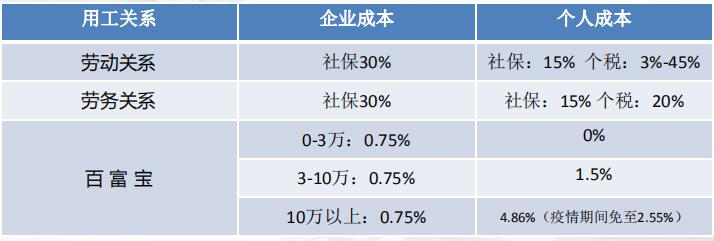 用工企業(yè)將原來(lái)與自由職業(yè)者直接結算服務(wù)費的模式轉變?yōu)榕c百富寶平臺結算項目總包服務(wù)費,由百富寶平臺與自由職業(yè)者個(gè)人結算個(gè)人報酬,相關(guān)納稅義務(wù)全部由百富寶平臺承擔。