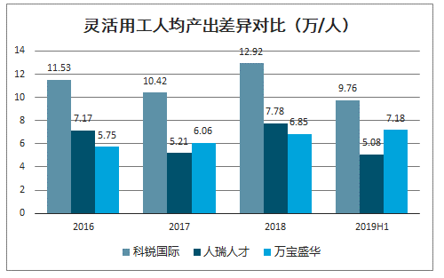 靈活用工派出人數高增長(cháng),人均產(chǎn)出維持高位??其J國際早在2006年便在國內領(lǐng)先布局靈活用工業(yè)務(wù),深耕本土14余年,先發(fā)優(yōu)勢明顯。從靈活用工派出人數來(lái)看,2016年公司派出4000人,2019年上半年增長(cháng)至13100人,年均復合增長(cháng)率達60.73%。從靈活用工人均產(chǎn)出來(lái)看,2019上半年為9.76萬(wàn)/人,有一定下滑。
