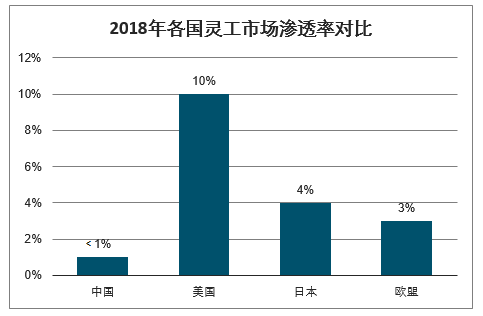 2018年各國靈工市場(chǎng)滲透率對比